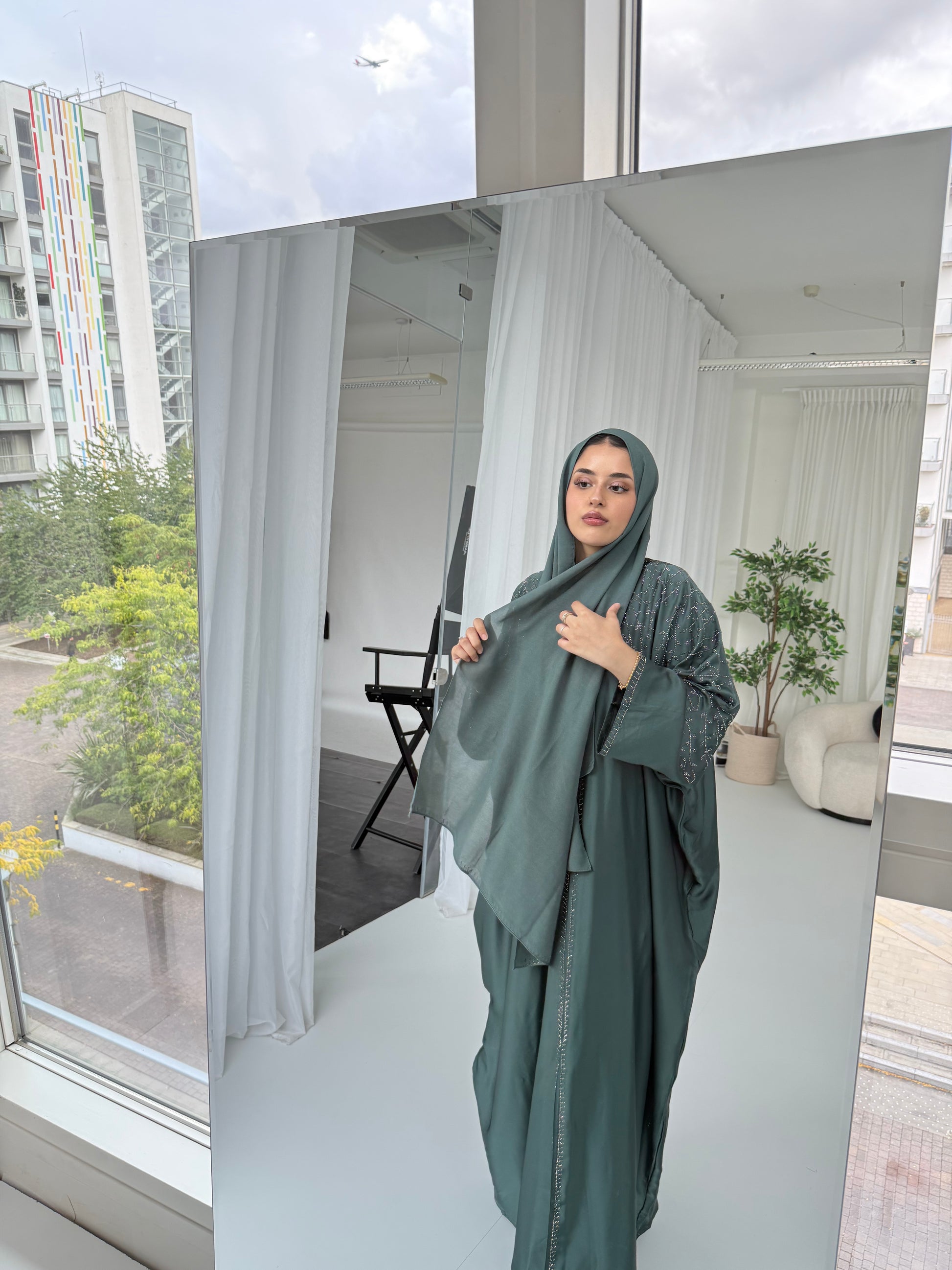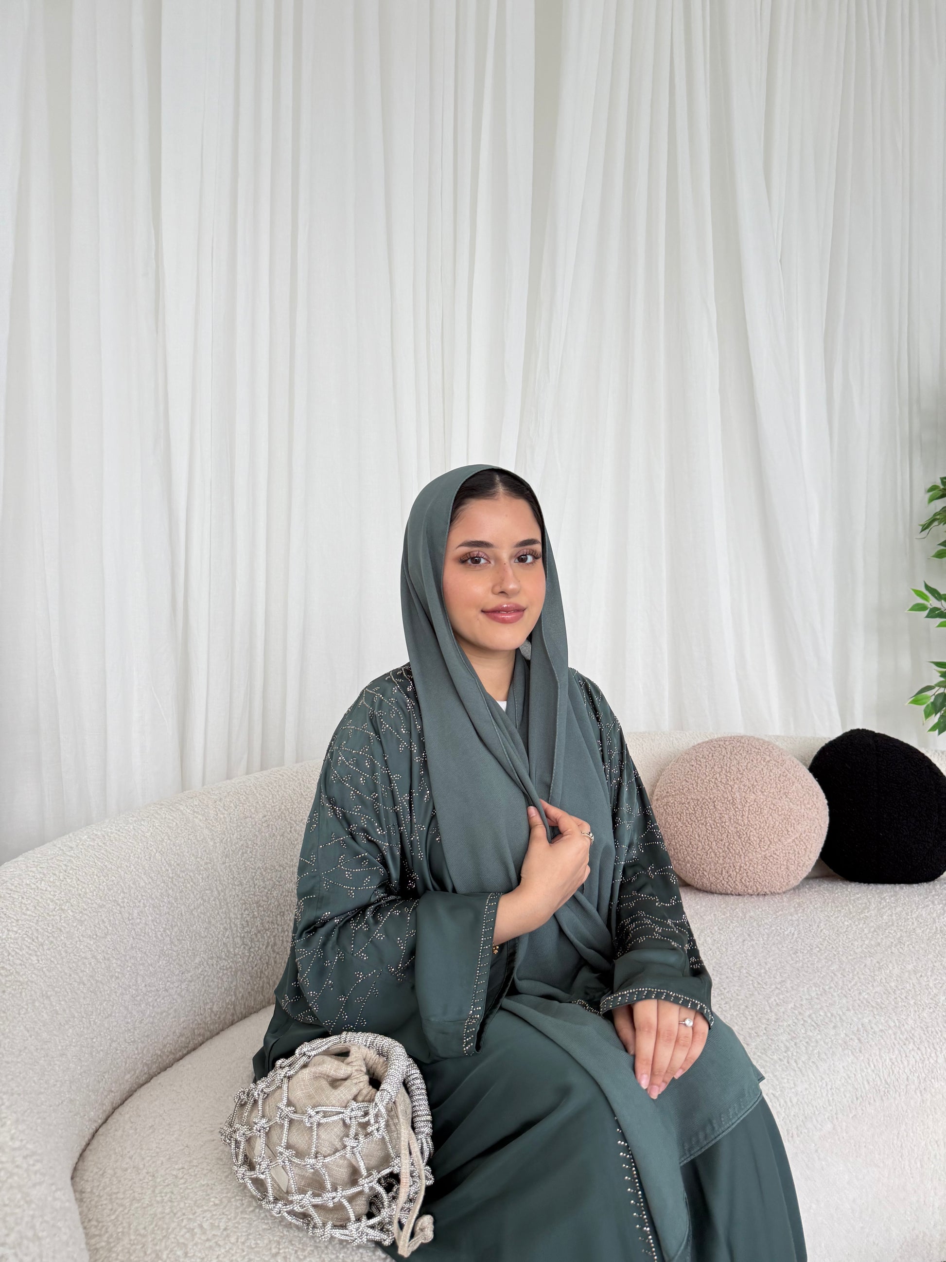 Dalia is a stone embellished abaya which is a statement piece for any wardrobe. Its versatile style transitions seamlessly from day to night, ensuring effortless elegance for any occasion. Whether paired with subtle accessories for a daytime look or elevated with bold accents for an evening event, this abaya exudes grace and refinement. Comes with a matching chiffon hijab.